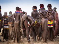 The Hamer tribe have unique rituals such as the bull jumping ceremony that boys go through in order to reach adulthood. It’s the ceremony which qualifies him to marry, own cattle and have children. The timing of the ceremony is up to the man’s parents and happens after harvest. As an invitation, the guests receive a strip of bark with a number of knots – one to cut off for each day that passes in the run up to the ceremony.