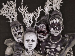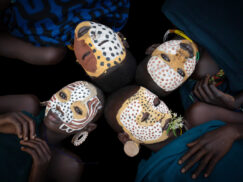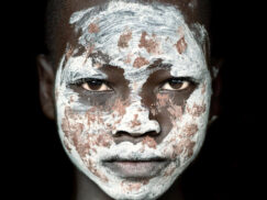 The Karo people differentiate themselves by excelling in body and face painting. They paint themselves daily with coloured ochre, white chalk, yellow mineral rock, charcoal, and pulverized iron ore, all natural resources local to the area. The specific designs drawn on their bodies can change daily and vary in content, ranging from simple stars or lines to animal motifs, such as guinea fowl plumage, or to the most popular – a myriad of handprints covering the torso and legs. The men use clay to construct elaborate hairstyles and headdresses, signifying status, beauty, and bravery.