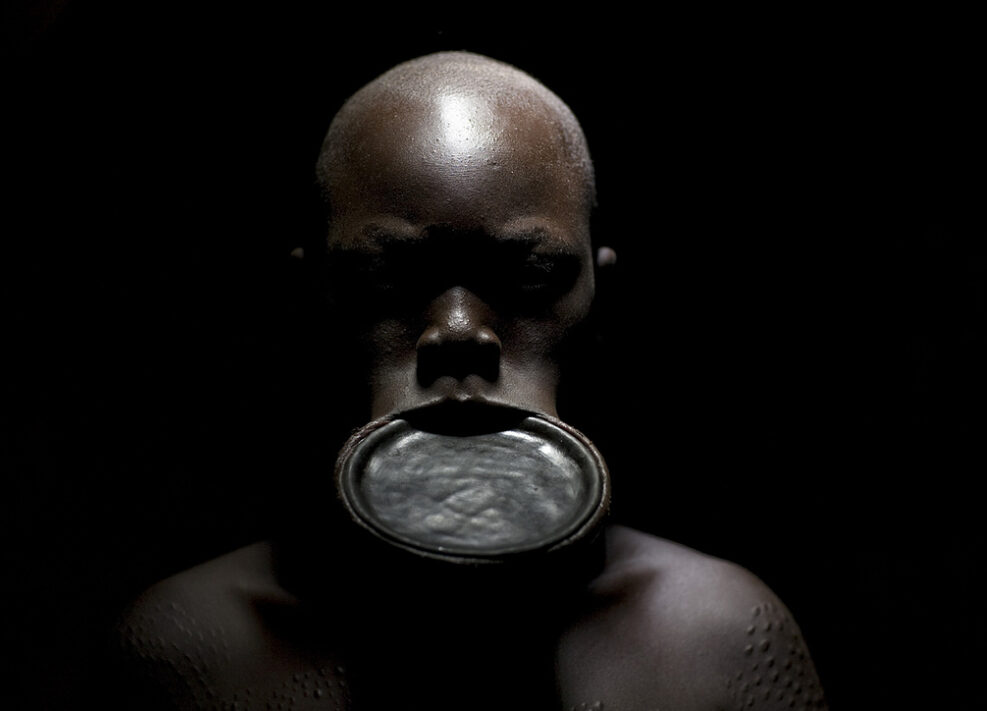 The Suri share traditions with the Mursi tribe and body decoration is an important marker of beauty. During adolescence, most girls have a plate inserted in their bottom lip as an indicator of attractiveness. Scars are also considered desirable and the Suri practice scarification rituals to create as many as possible.
